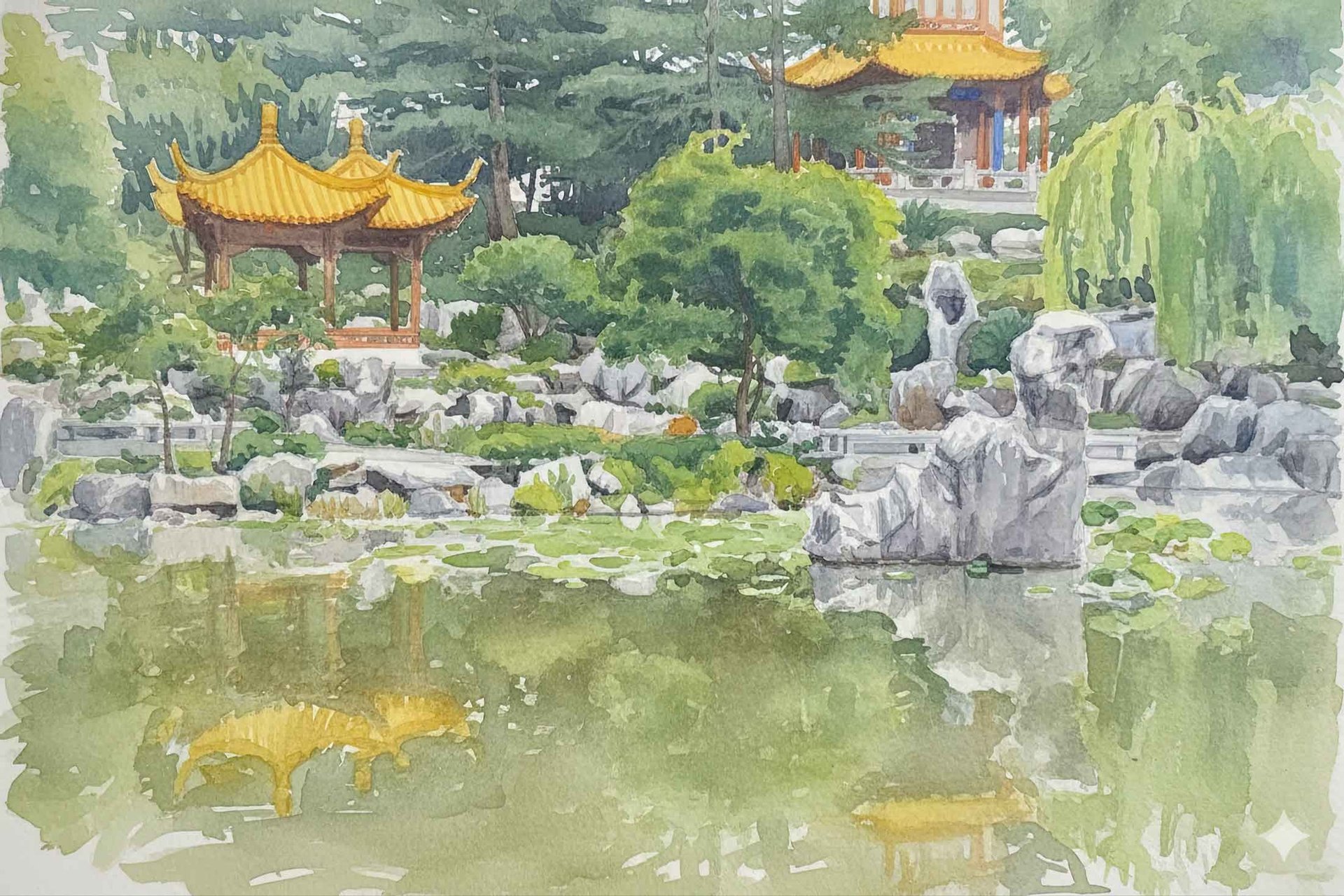 Traditional pavilions, waterfalls, and lotus ponds inspired by classical Chinese design